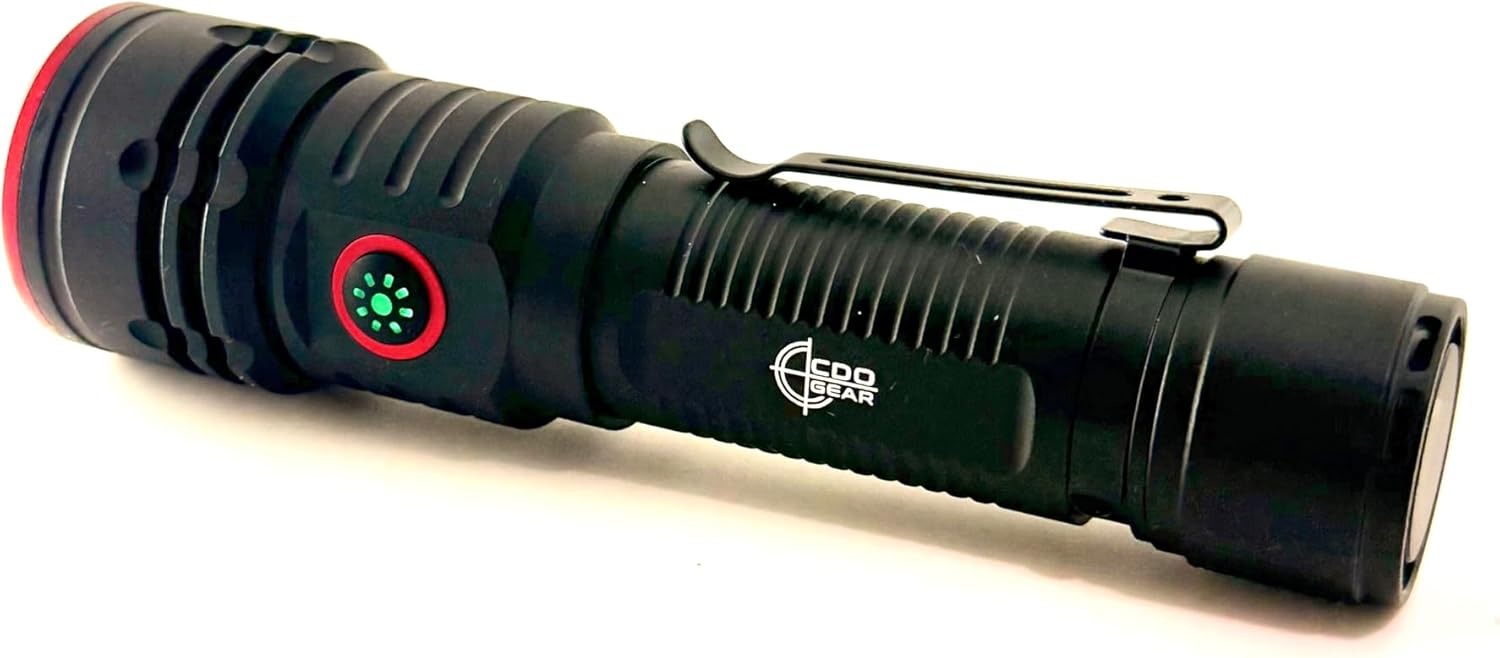 CDO Tactical Flashlight and Power bank 4000 mA 21700 Lithium Ion Battery Power Bank to charge your devices. LED 3 Bright XTE LED. 3 Levels of brightness, peaking at 2000 LUMENS. Tactical stroble light setting, and auto S.O.S. setting. Simple to use, cycling through Low, Med, High, Strobe, S.O.S. Magnet back-end for utility purposes. Great for, Outdoor Lighting, Emergencies, Work & Repair, Hiking Impact Resistance, with a runtime of 4 hours. USB-C charging IPX4 Waterproof Rating 200 meter Distance